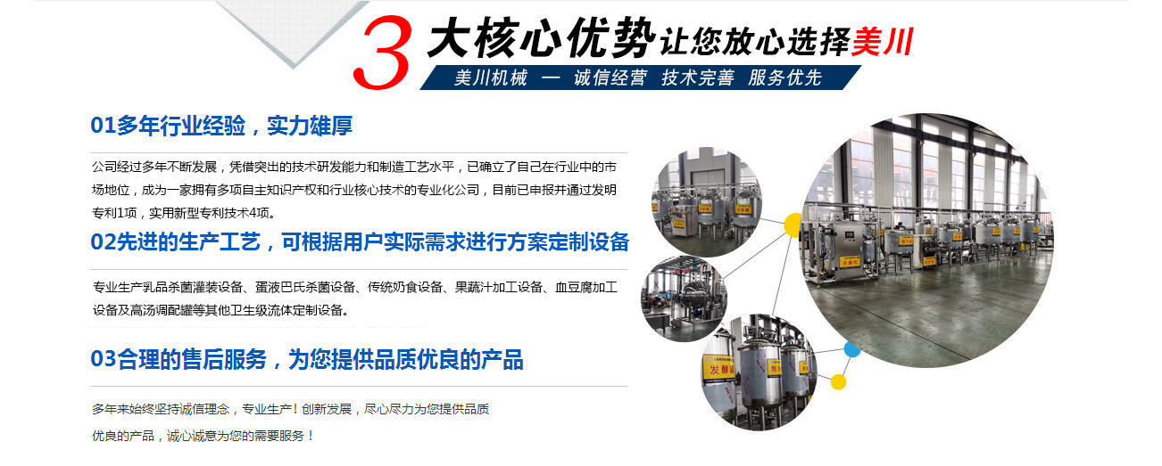諸城市美川機械有限公司坐落在美麗的恐龍之鄉(xiāng)——山東省諸城市東部,始建于2009年,是一家集乳品殺菌灌裝、蛋液殺菌、傳統(tǒng)奶食、果蔬汁加工、血豆腐加工、高湯調(diào)配等設備研發(fā)、工藝設計、生產(chǎn)制造、安裝調(diào)試,生產(chǎn)技術專業(yè)培訓,整線規(guī)劃為一體的智能化衛(wèi)生級流體生產(chǎn)線一站式供應商,目前擁有4個系列20多種產(chǎn)品,產(chǎn)品遠銷30多個國家和地區(qū)。